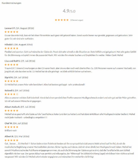 Überhaupt habe ich schon viele verschiedenste Veranstaltungen in fast allen Größenordnungen bespielt: Hochzeiten, Geburtstags-Partys, Jubiläen, Weihnachtsfeiern, Firmen-Events, Messen u.v.m. Auch habe ich schon vuiele internationale Hochzeiten und Feiern begleitet - türkisch-deutsche, russisch-deutsche, italienisch-deutsche, lettisch-deutsche und viele weitere Hochzeiten waren stets volle Erfolge, obwohl ich weder türkisch noch russisch noch lettisch spreche und mein Italienisch auch nicht gerade beeindruckend ist. Englisch hingegen spreche ich nahezu perfekt, und mein Französisch ist auch ganz passabel.